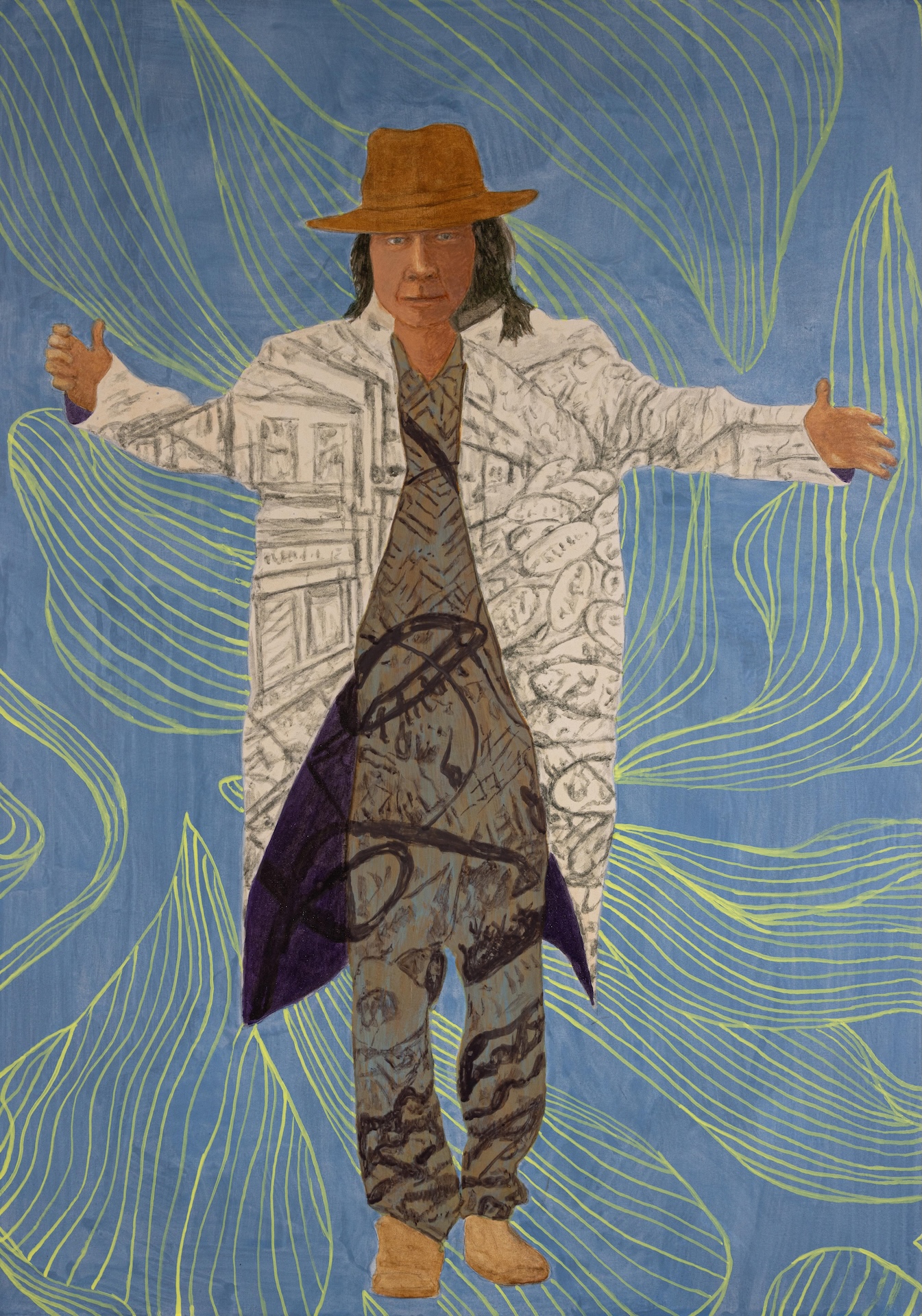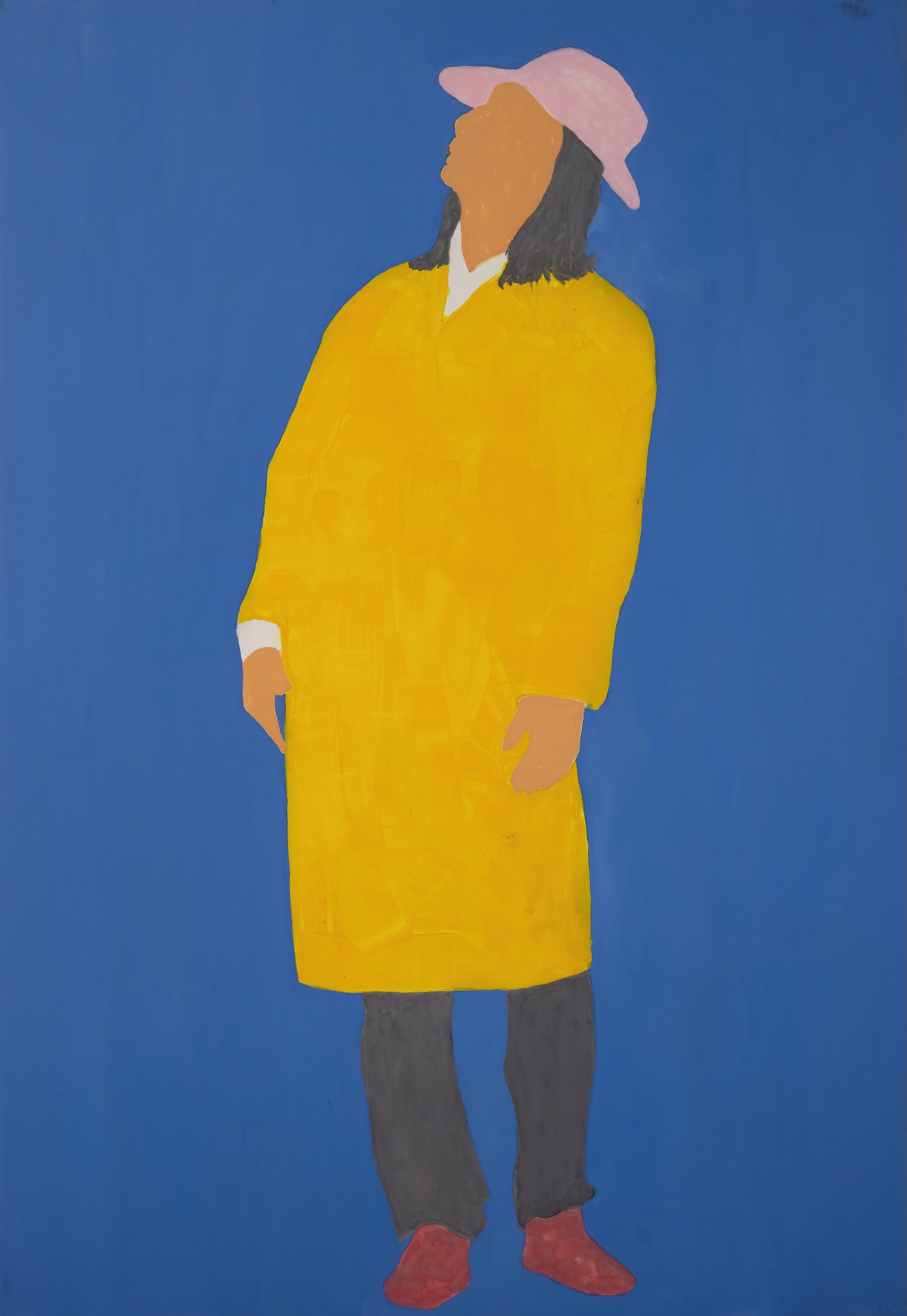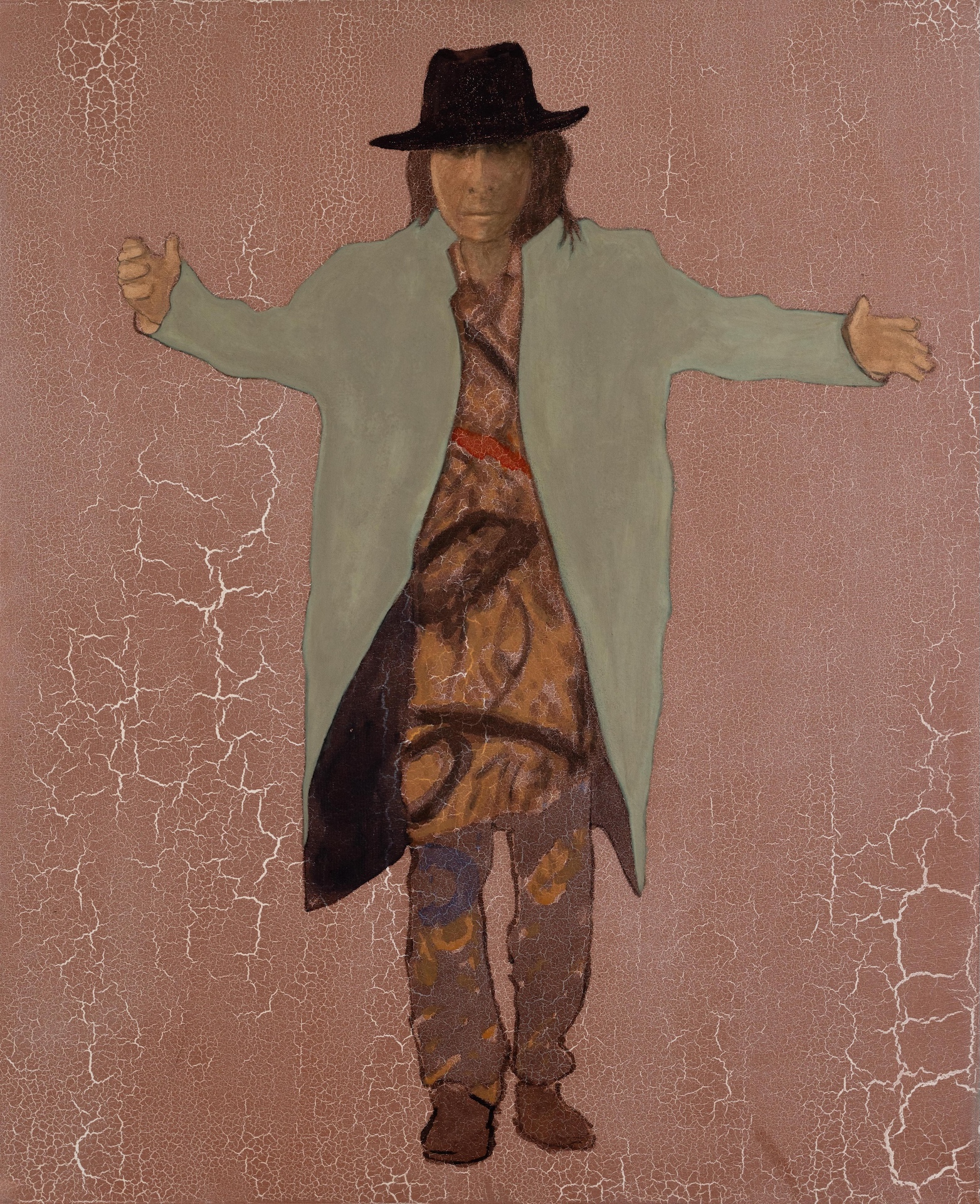 These clips soon began to take on a life of their own when Nagasawa put himself in front of the camera in various guises, including in Japanese clothing, sometimes obscuring his face with a hat or hood. This footage itself then became the source for new mineral pigment paintings, such as Invisible JA (2023), which focuses attention on his individuality, a way of countering the facelessness that can sometimes be the consequence of the imposition of group identity. Often working from video frames where he is frozen in an unbalanced position, the work nullifies motion, and depicts a character caught in the act, refusing expected narratives, and revealing human vulnerabilities.
